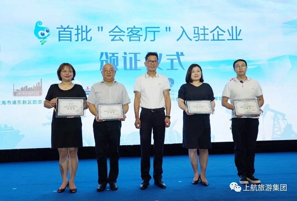 ▲上航假期总助龚飞(左二)代表上航假期获颁“临港新片区旅游联盟会客厅”首批入驻证