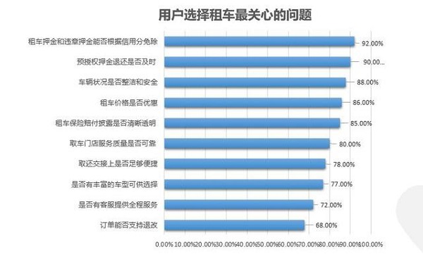 在租车阶段,用户对租车过程中的各项保障最为关心,超过90%的用户希望改变传统的租车押金模式。同时,在车况、租车价格、车型等传统关注点外,租车保险赔付披露是否清晰透明、取车门店服务是否可靠、是否有客服提供全程服务、订单能否支持退改等的关注也很强烈。