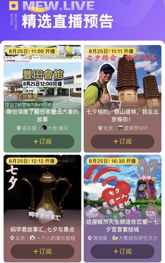 七夕当天,马蜂窝旅游上线了一系列七夕主题的旅游直播,金牌主播“进击的考拉君”和“意大利环意”分别前往大阪环球影城和意大利爱情小城维罗纳的朱丽叶旧居,解锁全球不同的浪漫旅行地。马蜂窝知名民宿主播“知宿老猫”将直播蟠龙山野长城的晚霞,陪伴用户度过一个浪漫的七夕。主播“蓝堡罗007”、“大套娃在呼伦贝尔”也将带领游客体验不同目的地和景区的七夕玩法。马蜂窝知名线下活动IP“未知饭局”在七夕当天直播两周年成都专场,与用户分享这份未知的喜悦。