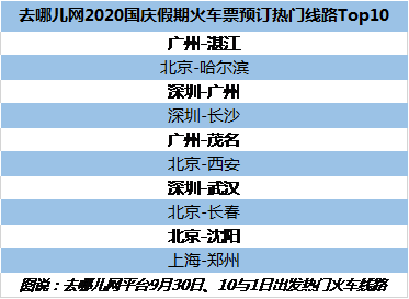 去哪儿网数据显示,从目前预订情况来看,广州-湛江、北京-哈尔滨、深圳-广州、深圳-长沙以及广州-茂名等线路成为今年国庆假期预订热度最高的五条线路;从旅客发送情况来看,深圳北站旅客出发量最高,长沙南站则成为旅客到达量最高的车站。
