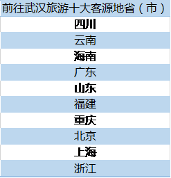 哪里的游客最爱来武汉?去哪儿网数据显示,来武汉旅行的游客多来自四川、云南、海南、广东、山东、福建、重庆、北京、上海和浙江;同时,武汉的部分客流来自湖北省内,孝感、宜昌、荆州、襄阳和黄石是主要出发地。