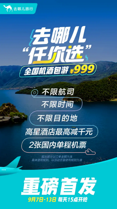 眼看国庆出游成本增加,去哪儿平台应需推出999元机酒包游套餐。2020年9月7日至13日每日15时,用户在去哪儿旅行APP参与【去哪儿“任你选”】秒杀活动,秒杀成功成功的用户即可获得999元机酒包游套餐。