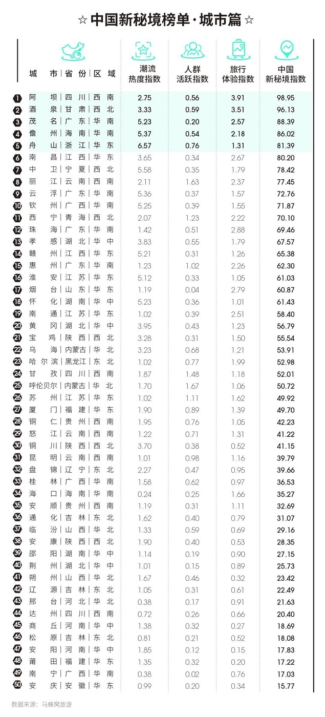 阿坝、酒泉、茂名、儋州、舟山、南昌、中卫、丽江、云浮、钦州位列“中国新秘境”城市榜TOP10;东台吉乃尔湖、墨石公园景区、清远笔架山旅游度假区、俄博梁、丹景山、红井路、杨家堂村、平潭岛、冷噶措、茫崖翡翠湖进入“中国新秘境”玩乐榜前十名。