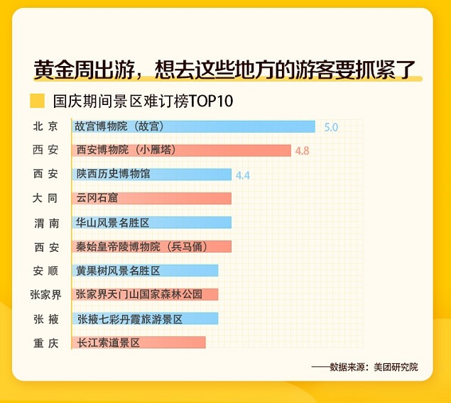 随着国庆出游人数的激增,部分景区也将出现供不应求的情况,根据美团门票难订指数显示,博物馆/院更加难订,其中故宫博物院、西安博物院、陕西历史博物馆等位列景区难订榜前三名。