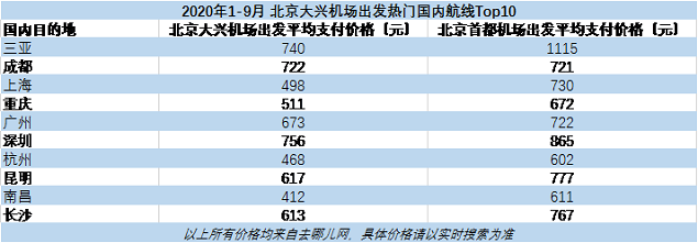 与首都机场进出的国内航班相比,大兴机场进出国内航班平均支付价格略低。以北京-三亚为例,去哪儿网数据显示,首都机场航班平均支付价格为1115元,同期大兴机场-三亚的平均支付价格为740元。