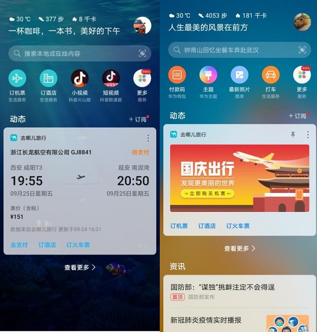 去哪儿和华为携手打造的出行助手,首先带给用户的是更加简单的操作。“华为智慧助手·今天:无微不智的个人助理”,能将用户所需服务从APP中一一提取出来,呈现在手机负一屏。这样一来,用户订阅去哪儿服务卡片后,无需再在屏幕间东翻西找,也无需浪费时间启动app。