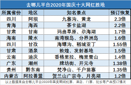 去哪儿平台综合机票、酒店、门票、玩乐等多项预订数据发现,以四川、青海、甘肃、云南、贵州、内蒙古为主的西部地区,热度同比去年还要高。特别是四川的阿坝、青海的海西,各项旅游产品销量同比增了1倍以上,成为今年国庆绝对的热门。