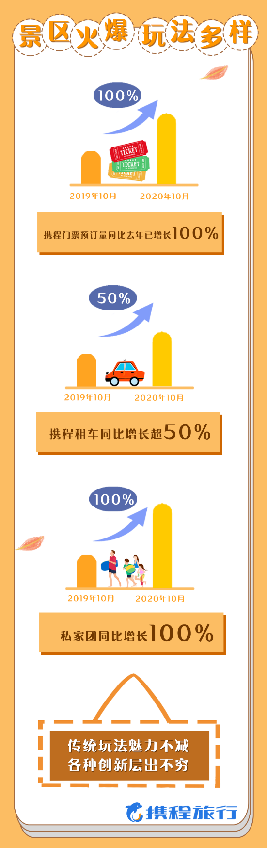 在全国景区按要求落实限量、预约、错峰、有序开放等措施的前提下,景区预约服务逐渐成熟,目前已有超万家景区可在携程门票平台进行预订、预约,很多热门景区游客接待量已接近去年同期。加之,哈尔滨、沈阳等全国多地发放补贴,携程在节前推出的“十一FUN价 属你会玩”门票专场促销,数百万用户第一时间领取,使用范围覆盖全国数千家景区,旅游需求得以进一步释放。