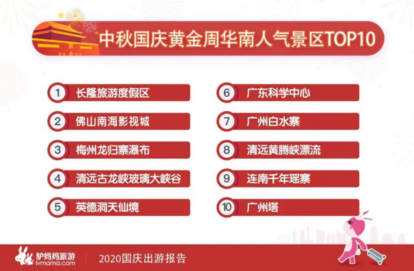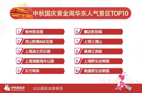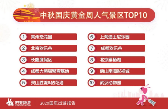 《报告》同时显示,常州恐龙园、北京欢乐谷、长隆度假区、成都大熊猫繁育研究基地、灵山胜境&拈花湾、上海迪士尼乐园、成都欢乐谷、北京雁栖湖、佛山南海影视城、武汉动物园为今年国庆期间全国热门景区TOP10。