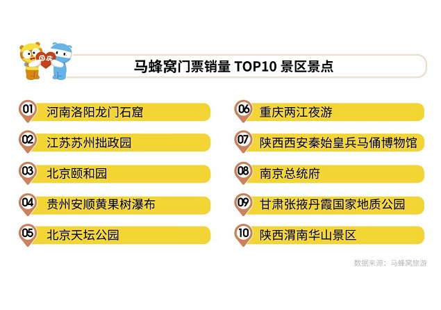 在全国众多选择中,历史文化类的景区更能获得游客的青睐。在马蜂窝平台上,门票销售最火爆的十个景区景点是:河南洛阳龙门石窟、江苏苏州拙政园、北京颐和园、贵州安顺黄果树瀑布、北京天坛公园、重庆两江夜游、陕西西安秦始皇兵马俑博物馆、南京总统府、甘肃张掖丹霞国家地质公园和陕西渭南华山景区。其中,历史文化类景区占比达到半数以上。张掖丹霞国家地质公园的门票销量相较于今年五一上涨了近30倍,龙门石窟门票相较于今年五一上涨超过10倍,马禹涛介绍,国内疫情防控形势给了年轻游客安全出游信心。全国各大景区推出的预约服务和智能化的高水平管理,也为游客的参观游览提供了有力的安全保障。