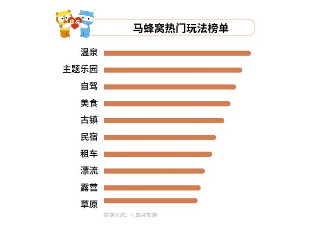 旅游玩法方面,老少皆宜的温泉仍是中国游客最为关注的玩法。主题乐园仍是亲子客群和年轻人的最爱。自驾、租车等私密化的出行方式,漂流、露营 、草原等户外玩法均受到游客欢迎。