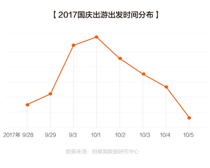 而与往年不同的是,本次国庆期间错峰出游的趋势并不明显。数据显示,出游人数从9月30日才开始猛增,在10月1日国庆节当天达到峰值。而蚂蜂窝《2016年十一旅游趋势报告》显示,去年仅三成游客选择在10月1日当天出游。