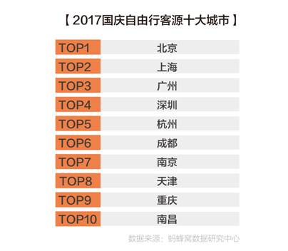 2017年国庆期间,境内热门目的地前十分别是北京、上海、成都、重庆、西安、杭州、广州、三亚、厦门和青岛。