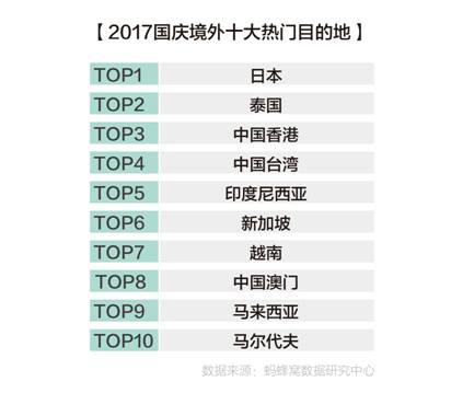 2017年国庆期间,境外热门目的地前十分别是日本、泰国、中国香港、中国台湾、印度尼西亚、新加坡、越南、中国澳门、马来西亚和马尔代夫。
