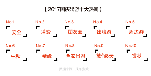 与此同时,由于近期恐怖袭击与自然灾害频发,中国游客今年国庆期间最关注的出游问题是“安全”。同时, “爆买”虽已过去,但与消费相关的话题内容仍是中国游客关注的重点之一。排在第三位的旅游关键词是“朋友圈”,旅游的社交属性正在进一步放大,今年国庆期间又将迎来新一轮朋友圈摄影大赛。