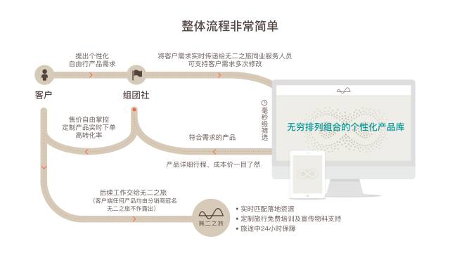随着大数据库的建立,无二之旅已经有了大量批发旅游路线的能力。作为定制游行业标杆,一直有大量同业前来询问是否能与无二之旅合作定制产品线,希望转化目前日渐流失的年轻客群。于是自去年下半年开始,无二之旅展开了与旅行同业及OTA大量合作,将数据库中的海量路线提供给各前线旅行社、门店等,同业只需完成销售自身毛利就可高达10%,后端有无二之旅的全程品质保障,且不对消费者作任何品牌露出。目前较为成熟的合作方,无二之旅提供的路线解决方案能帮两三人的小门店月盈利十万左右;实用的产品模式不仅转化了老客户,还帮合作方吸引了不少新的客群。现在无二之旅在全国已初步筛选了一批优秀的同业合作,并在华东、华南、西南片区都设有服务同业的分公司。光有技术是不够的,同业合作人员均具备多年旅行社从业经验,手把手以无二之旅多年摸索出的定制实战经验,教导和辅助刚刚起步转型开始售卖定制游的合作方,并免费提供大量培训和宣传物料,迅速实现双赢。随着全国布局的开展,与旅行社的订单量持续增长,目前成交额已达到上亿元。