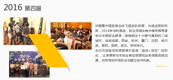 2012-2017年期间,旅业传媒主办了百余场活动,同时还为诸多海内外旅游局、旅游机构承办过路演推广活动,拥有十年以上的丰富路演推广活动经验。