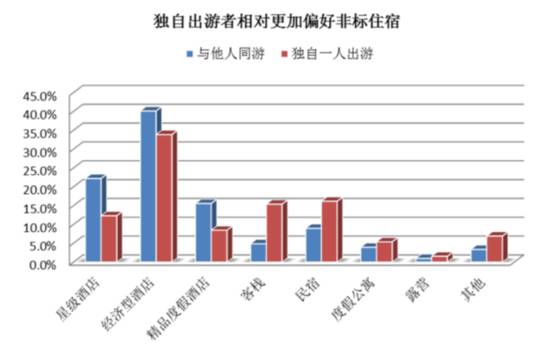 大交通工具方面,独自出游者最青睐飞机,其他大交通方式依次为:高铁、普通列车、自驾车、长途巴士。与有同游伙伴的人群相比,独自出游者在旅行住宿方面明显更加偏爱客栈、民宿、度假公寓等非标准住宿,体现了他们对于个性化旅途住宿的偏爱以及对住宿品质的追求。针对这部分人群的需求特征,同程旅游1111酒店节不仅在优惠幅度上足够有诚意,而且还特别汇聚了主要城市的高星级和个性化酒店供用户选择,例如句容碧桂园凤凰城酒店、上海大船酒店、湖州莫干山芝麻谷艺术酒店等。