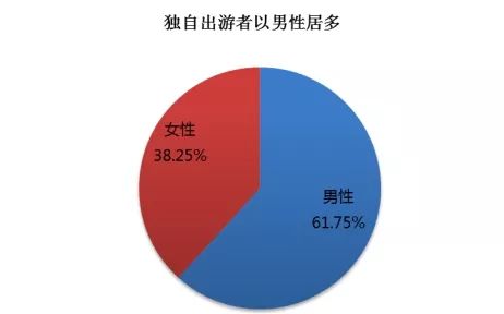 根据同程发布的数据,中国独自旅行者中,男性游客占到61.75%,女性游客占到38.25%,男性占比更高。报告认为,当今社会男女比例失衡,导致更多的男性被“剩下来”,独自旅行则成了这些“单身贵族”享受生活的一种方式,以此来满足精神需求,提升生活幸福感。