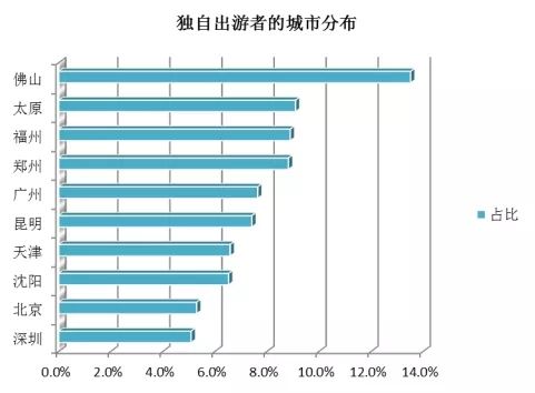 报告数据显示,盛产独自出游者的十大城市包括佛山、太原、福州、郑州、广州、昆明、天津、沈阳、北京、深圳。