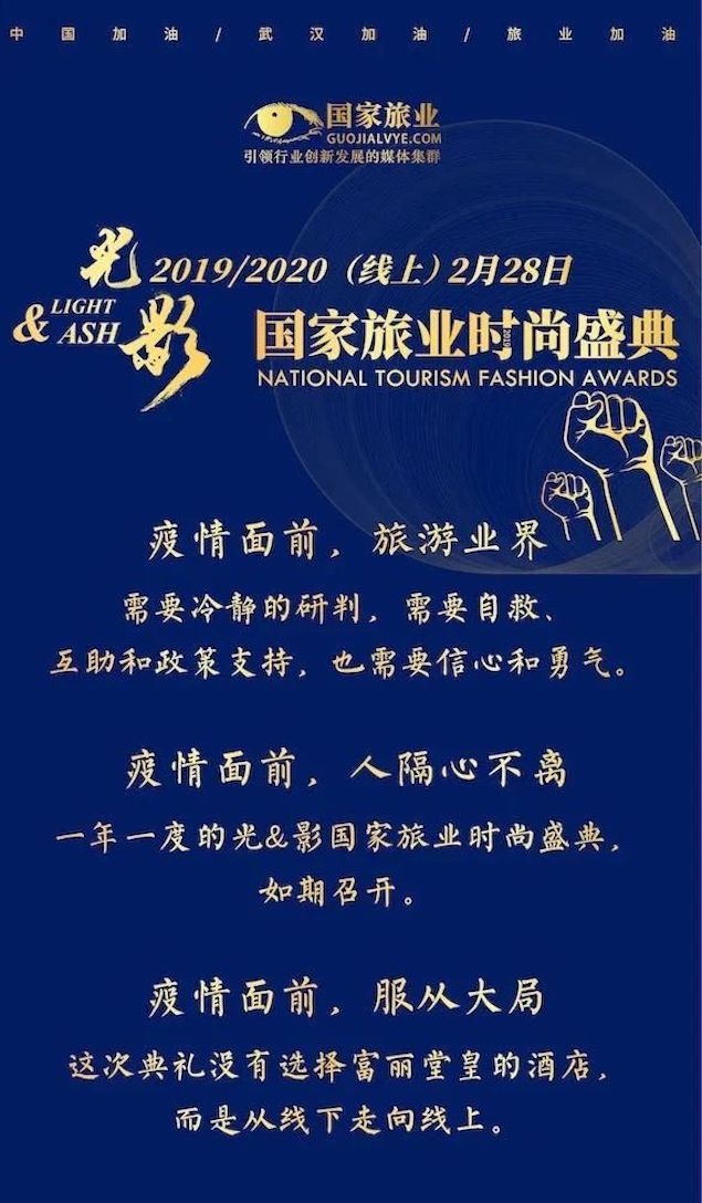 2020年2月28日, 来自海内外的旅行社、在线旅行商、航空公司、景区、酒店和旅游推广机构负责人共2万多人在线参与了2019/2020光&影国家旅业时尚盛典,这是旅游行业首个全程线上直播的颁奖典礼。