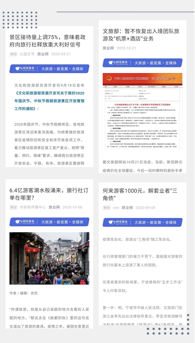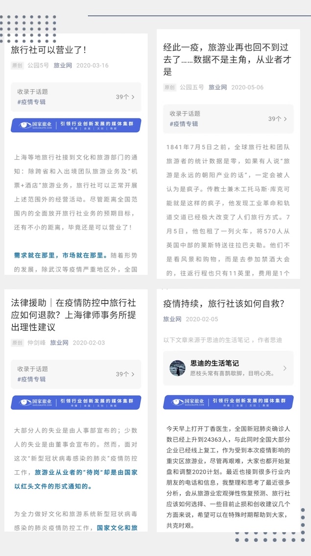 在旅游战疫的关键时期,国家旅业网想业者之所想,急业界之所急,每天坚持在旅业网、旅业头条、旅游口碑、旅业TV、锐旅行会客厅、旅业百人会等媒体矩阵,持续发布行业信息,先后有多篇原创文章阅读量达到10万+,更有多篇过万阅读量的资讯和文章。这些文字不仅传递了海内外业者守望相助的温暖,搭建了沟通的桥梁,更为行业带来前行的力量和信心。