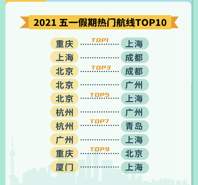 上海、北京、三亚、广州、成都、重庆、西安、厦门、杭州、深圳都是热门出行目的地。扬州、舟山、北海、敦煌、恩施、海口、三亚成为今年五一的黑马目的地。