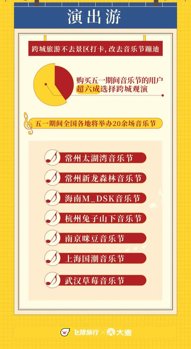 年轻人当道,令今年“五一”出现了不少新玩法。与其跨城景区打卡,不如音乐节蹦迪。飞猪与大麦平台联合发布的数据显示,“五一”长假期间,全国各地将举办20余场音乐节,多场音乐节落地到旅游城市,如常州太湖湾音乐节、常州新龙森林音乐节、海南M_DSK音乐节、杭州兔子山下音乐节、南京咪豆音乐节、上海国潮音乐节、武汉草莓音乐节等。购买“五一”期间音乐节的用户中,超六成选择跨城观演。