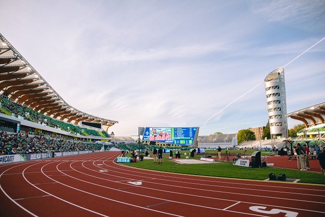 比赛场地是俄勒冈大学(University of Oregon)海沃德田径场(Hayward Field)。海沃德建于1921年,以教练比尔·海沃德(Bill Hayward)的名字命名。他在俄勒冈大学担任田径教练 44 年,曾任6届美国奥运队田径教练,培养了诸多世界纪录和美国纪录保持者、多名奥运奖牌获得者,奠定了尤金“美国跑城”(Track Town USA)的基础。