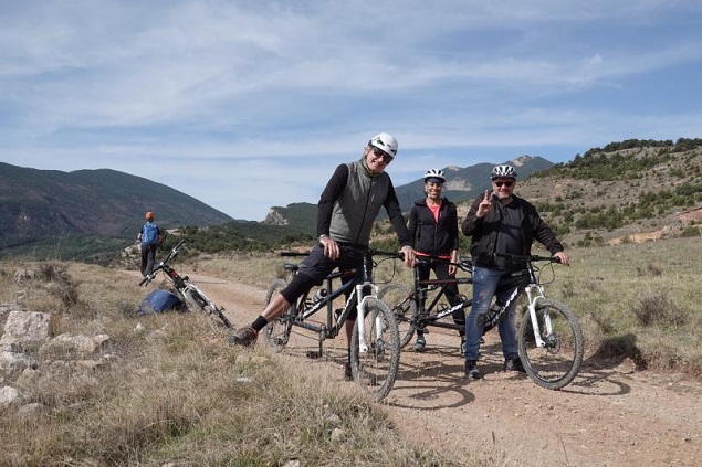 我们骑上她的特制双人座电动山地自行车,前面坐导游,后面坐客人比如盲人;也尝试了腿部功能丧失者的专用电动手摇登山车。骑行在碎石泥道上,穿越山头和自然公园Cadí-Moixeró 的小村庄,只见山坡上羊群悠闲,村头超大型狗狗汪汪叫,同时很友好,山群和周边静谧祥和。美女总裁的专用设备与创新服务,很让人感动。能关注到这个极易被忽视的群体,把残障人士带到高高的山上,呼吸清爽空气,到农户家里用餐,倾听法国边界远久的故事,她的内心有着怎样的大爱!
