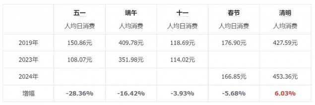 根据上述数据不难算出,2024年清明假期,国内游客人均消费较2019年同期增长6.03%。