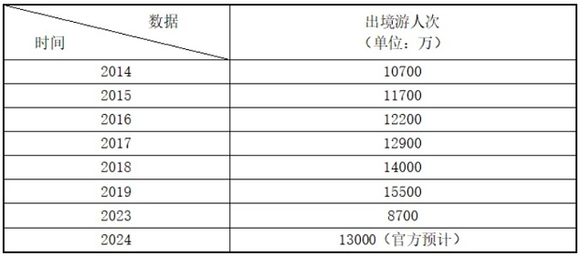 自2023年出境游重启以来,随着签证等相关政策的优化、调整,航司运力、地接资源等持续恢复,广大游客的出境游意愿不断提升,进入2024年之后,出境游市场终于厚积薄发,我国也再度成为全球最大的境外旅游消费国。中国旅游研究院发布的《中国出境旅游发展年度报告(2023-2024)》显示,2023年,出境旅游人数超过8700万人次,预测2024年出境旅游人数将达1.3亿人次。