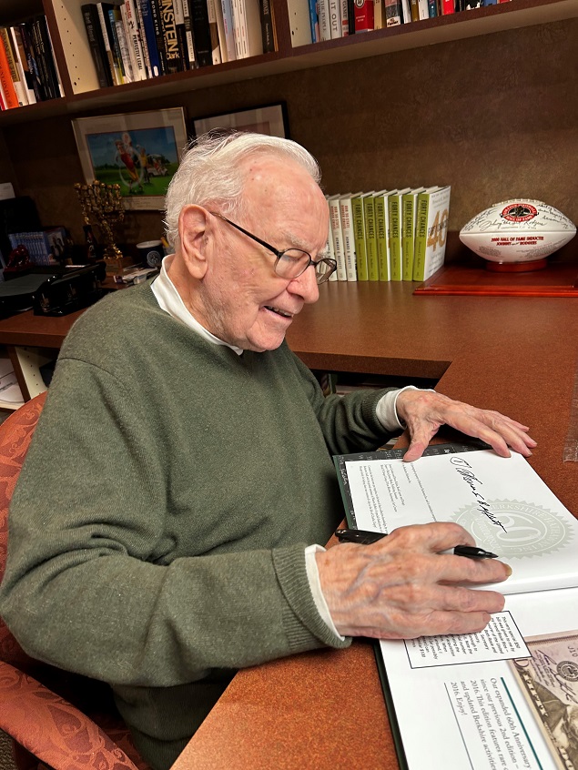 巴菲特为慈善机构筹款书籍签名(图源:伯克希尔公司Berkshire Hathaway)