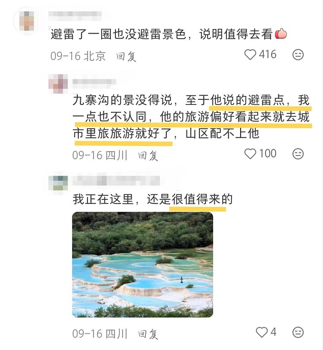 在一篇九寨沟景区避雷的帖子下面一位网友直指发避雷帖的网友是“去错了地方”